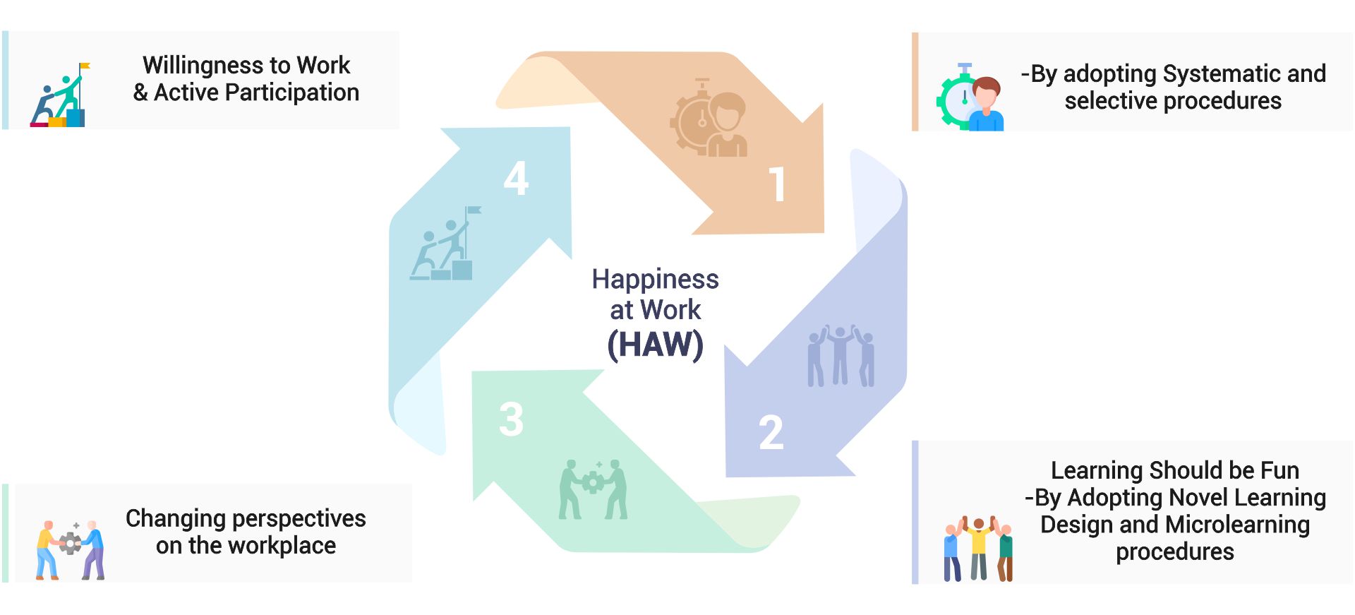 Happiness at Work (HAW) is built through a systematic, practical, and emotionally engaging cycle. It starts with structured procedures, fun and relevant learning experiences, and leads to a genuine shift in how employees view their work. The final outcome is an active, willing workforce that thrives on participation and purpose. “When happiness becomes part of the system, participation becomes effortless.”